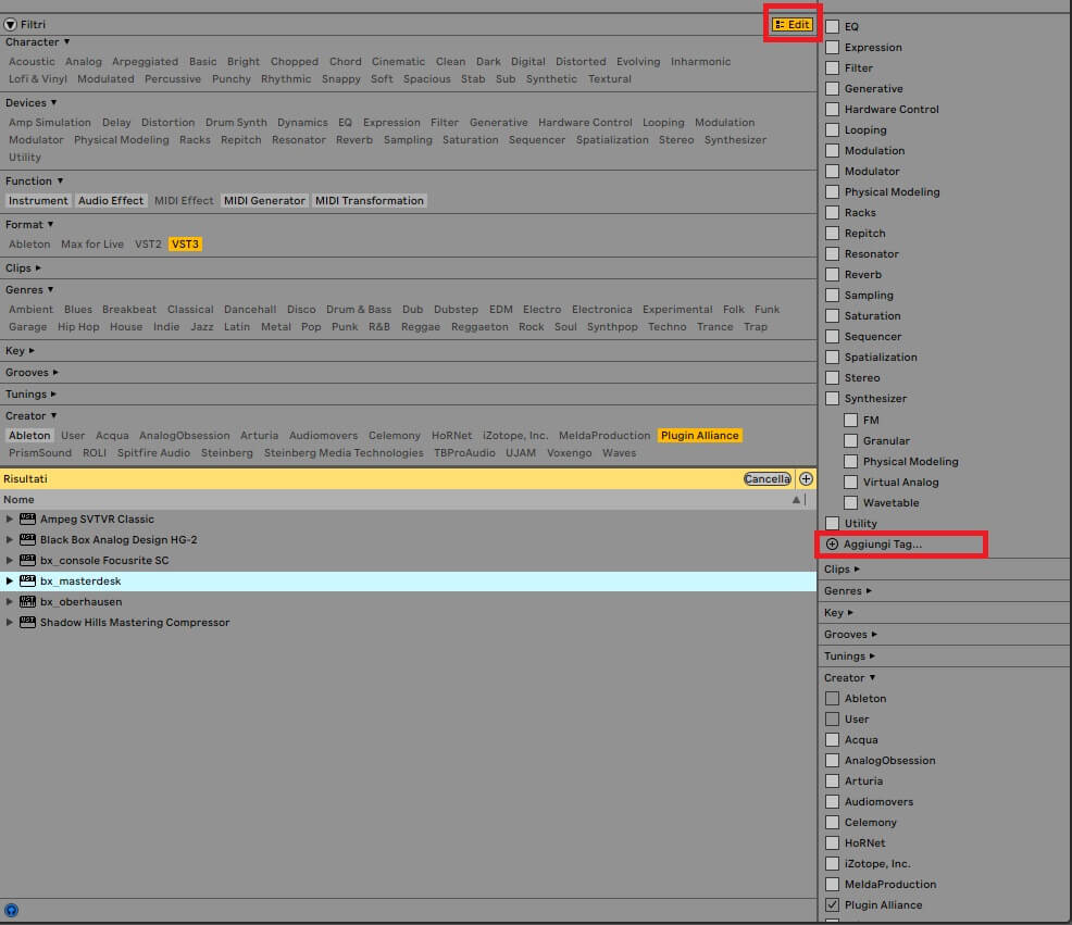 La seconda cosa che mi incuriosiva di più era il browser. Non mi sono trovata da subito con questa nuova configurazione. La rimozione di cartelle e sottocartelle a vantaggio di filtri e tag, almeno all’inizio, l’ho trovata ostica. Questo sistema è indubbiamente più flessibile permettendo più personalizzazione nei parametri di ricerca. Una query generica, ad esempio di un lead, restituisce un’ampia gamma di preset, loop, campioni, ulteriormente filtrabili per categoria, caratteristiche sonore etc. etc. Semplicemente bisogna prenderci la mano. L’unica pecca è il fatto che il sistema crea una sorta di distinzione fra il contenuto interno a Live e la tua libreria che, invece, può essere filtrata solo per aspetti minimi (ma questo era prevedibile). Ottenere il massimo da questo sistema significherà investire tempo per taggare tutto il proprio materiale, sempre che qualcuno ne abbia. Per farlo possiamo sfruttare sia i tag interni a Live che crearne di nuovi.