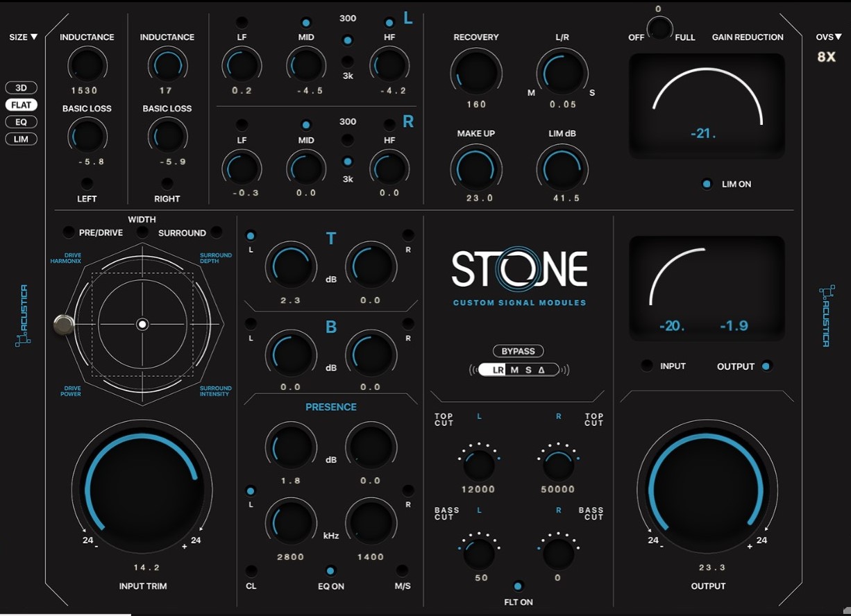 Gli elementi che compongono Stone Pro hanno una catena fissa: stadio di ingresso e drive seguito da più stadi di equalizzazione (AM23/9/1, CHILT-QM ed EQ3/12/211) che sono inseriti per lavorare assieme alla ricerca del timbro. I filtri (AM0/168/1) hanno un range più esteso dell’originale per correzioni più chirurgiche. Il limiter è posto dopo gli equalizzatori e prima della sezione di Output. Stone Pro può essere visualizzato in formato 3D, richiamando i controlli dei moduli originali, o in Flat View, un layout a due dimensioni con tutti i parametri. Due ulteriori modalità consentono di lavorare esclusivamente sulla sezione EQ, con tanto di grafico finale, o Limiter View che vede anche l’introduzione di un radar loudness per LUFS Momentary molto efficace e già ben noto a chi si occupa di mastering.. Come sempre, è incluso l’oversampling e la dimensione della finestra del plug-in.