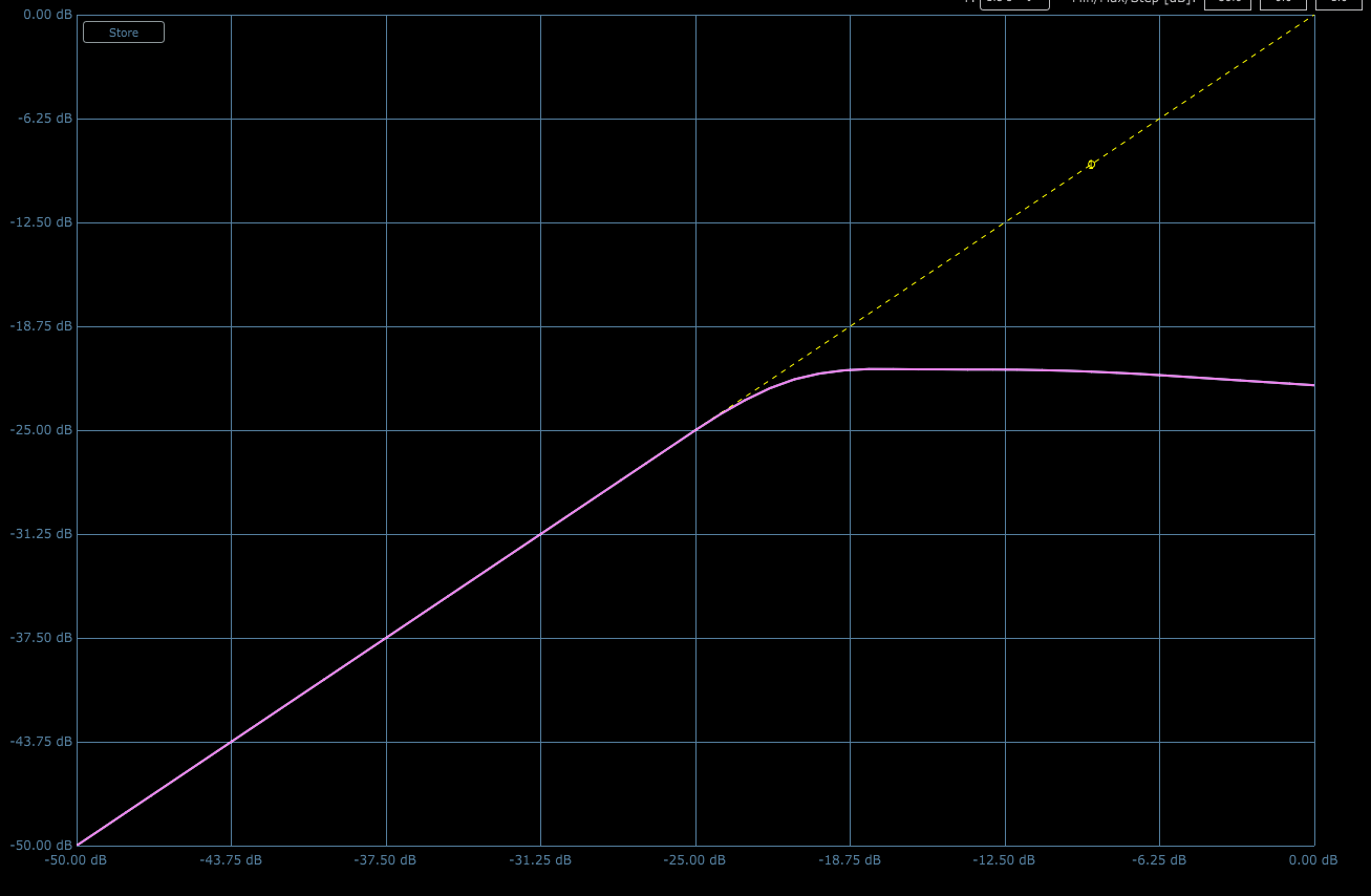 Una delle caratteristiche nascoste, che rende unico questo limiter, è la capacità di lavorare in compressione negativa. Il trucco si vede solo per limiting molto elevati. La curva del limiter è di tipo soft. La compressione negativa si realizza solo se si interviene pesantemente con limiter abbassando la soglia, che significa in termini reali aumentare il segnale di ingresso con Input Trim, indipendentemente dal valore di dB di limiting.