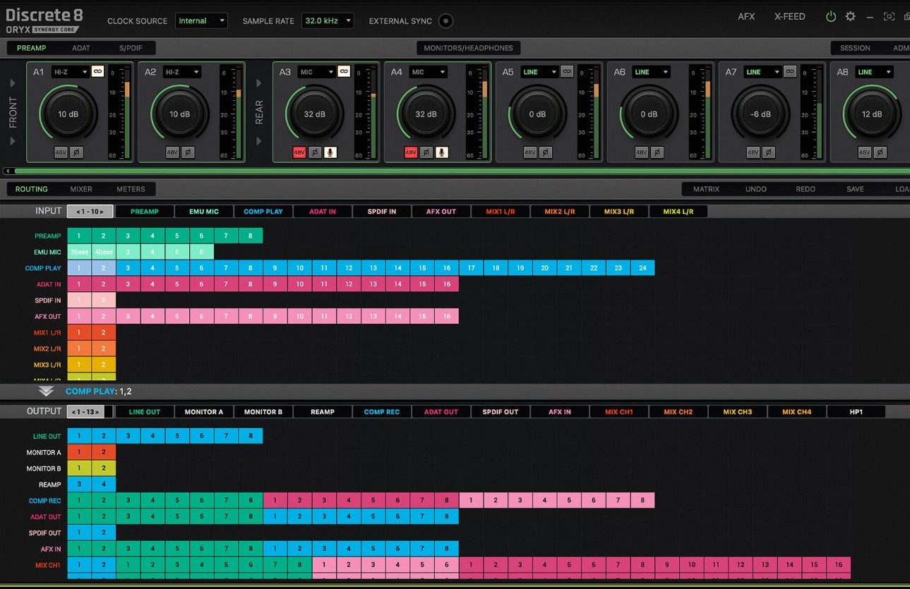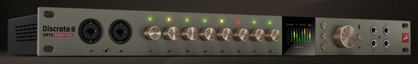 Nata per essere la base di uno studio di registrazione e per il mix, grazie agli otto ingressi con preamplificatore, le quattro uscite cuffie ognuno con livello indipendente, ed effetti on board grazie alla tecnologica Synergy Core FX, Discrete 8 Oryx ha nuovi convertitori AD e DA e un clocking di quarta generazione a 64 bit AFC, pronto per essere distribuito, grazie alle tre uscite Word Clock, a qualsiasi interfaccia o device digitale per rinnovare la qualità di conversione.