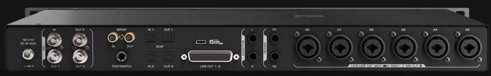 Le connessioni su pannello frontale includono due Combo XLR/TRS, da usare anche come ingresso ad alta impedenza per strumenti musicali, e quattro uscite cuffie. Le connessioni posteriori includono un ingresso Word Clock e ben tre Word Clock out, utili per ridare vita a qualsiasi convertitore non recente, due porte S/PDIF su RCA, un ingresso per pedale, quattro porte ADAT per 16 canali, una connessione DB25 per otto uscite analogiche, porta USB 2 tipo C, due uscite per reamp e gli otto ingressi su Combo per preamp e line.