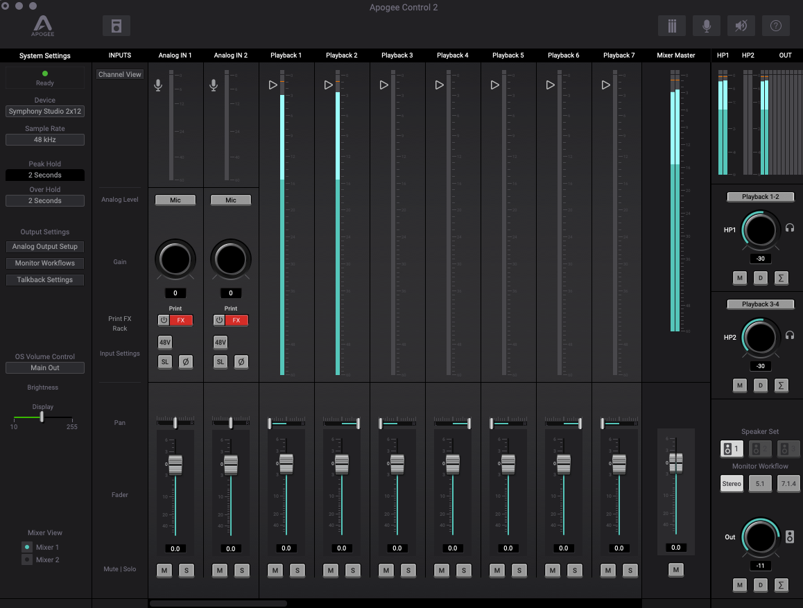 On first startup, Studio Symphony updated immediately without any problems, although during the transfer of formware it produced a digital noise that forced us to lower the monitor level. After that, everything ran smoothly. Opening Apogee Control 2, we found ourselves navigating through the windows without the need to read the manual. It is all very clear and simple: the only thing to know is the routing assignment to the internal mixer from the Output window, choosing precisely Mixer L, R, and 1 or 2 as the assignment. On this occasion, the internal mixer becomes interesting for tracking. By default, Symphony Studio arrives with the ECS channel strip for analog inputs: the compressor is so simple. The preamps are transparent and very neutral, suitable for recording a track to be processed later with emulation plug-ins. They don't impose a sound, but the microdetails are excellent: the conversion, the clock accuracy, which has always been an absolute strength of Apogee since the days of Big Ben (which continues to this day!), and the analog front-end allow for top-class conversion: dynamics that are never disjointed, speed in transients, and no sibilance that goes off on a tangent. Above all, the dynamics appear expanded, compared to other converters in the same price range: low frequencies are picked up with nice detail on the envelope, and there is a description of rooms that easily become three-dimensional, thanks to the excellent A/D conversion.