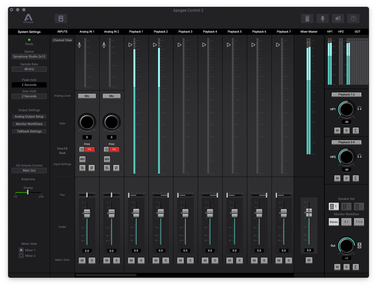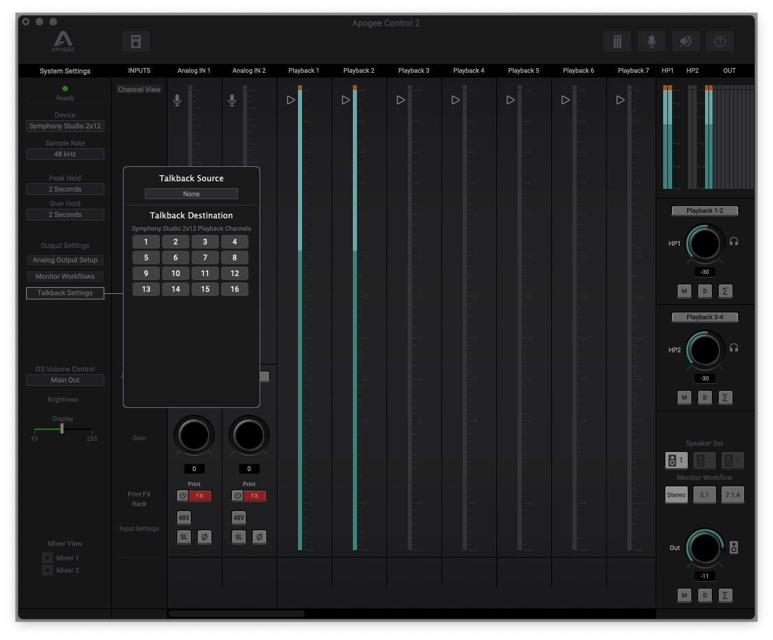 A parte la selezione dell'uscita audio dalle preferenze di MacOS e Windows, Studio Symphony beneficia di un controllo remoto software diviso in sezioni: System Setting, Input Channel, Output Channel e Monitor. La toolbar di Apogee Control 2 permette di resettare il metering, attivare il talkback (l'interfaccia non è dotata di microfono incorporato), mettere in mute tutte le uscite audio e aprire la finestra di Remote Assign.