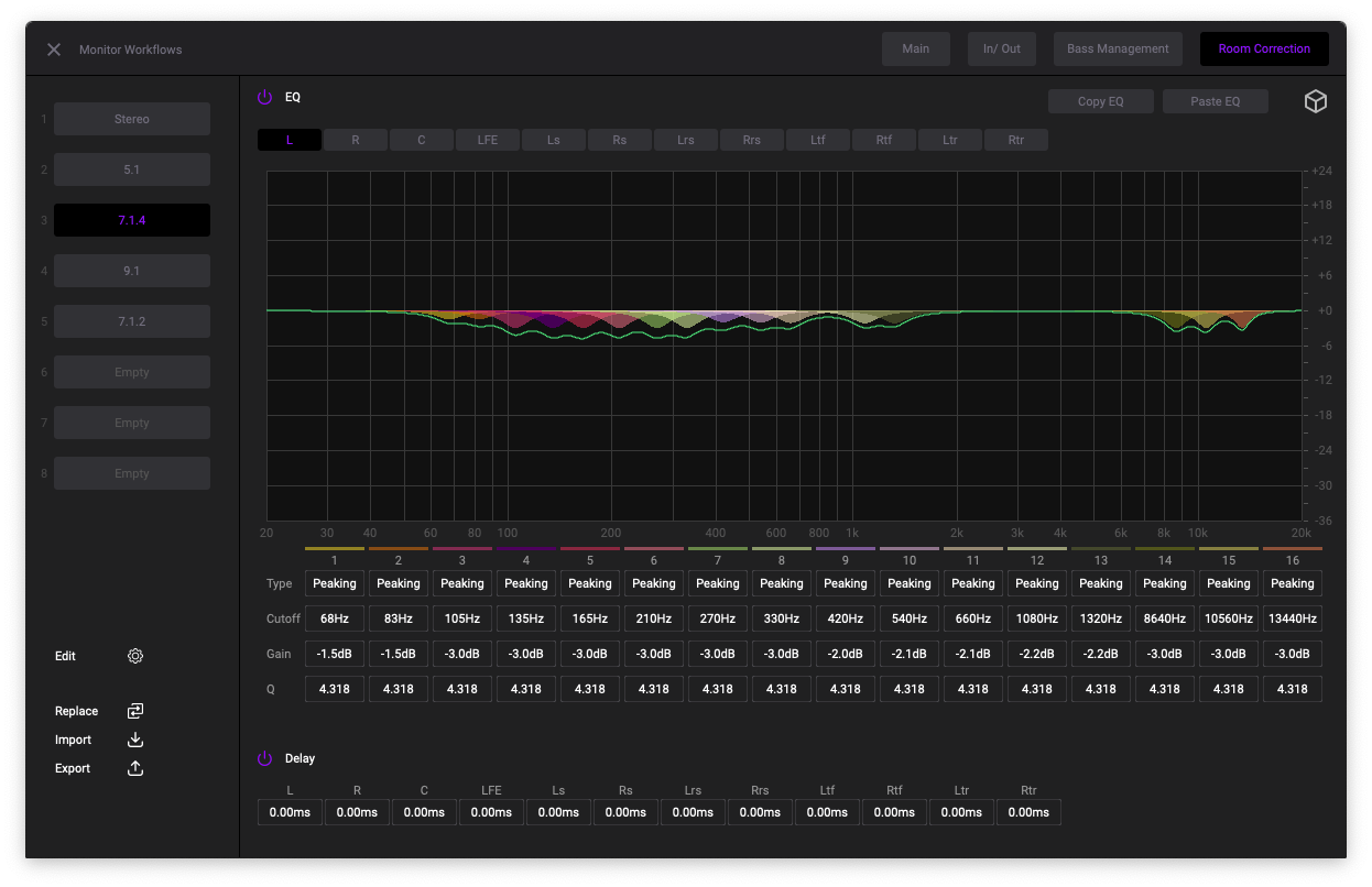 La sezione di Monitor Workflow comprende quattro pannelli: Main, In/out, Bass Management, Room Correction, oltre a un elenco di setup, default o custom, che possono essere immediatamente richiamati, con le classiche funzioni di Edit, Replace, Import ed Export.