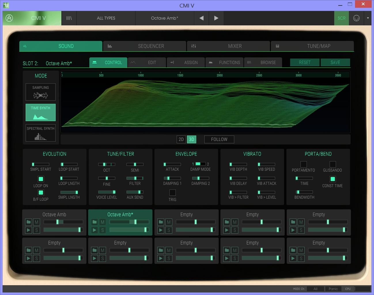 L’interfaccia del CMI V è stata semplificata per snellire il workflow: sulla tastiera virtuale troviamo i controlli Macro assegnabili (sei switch e altrettanti fader), mentre in un controller separato sono disponibili fader per parametri di Filter, Sample Start, Vibrato Speed, Vibrato Depth, Aux Level, Attack, Damping 1/2. In una seconda finestra è raffigurato il case del CMI originale, ma soprattutto il suo famoso schermo a fosfori verdi che qui dispone di quattro modalità operative: Sound, Sequencer, Mixer e Tune/Map. Nel sottomenu Edit del modo Sampling in area Sound – attraverso il pulsante Analyse – si giunge all’analisi FFT (Fast Fourier Transform) del campione importato, per elaborarlo in seguito nella modalità Time Synth. Il modo Spectral Synth consente di arricchire il contenuto armonico di una patch grazie alla sintesi additiva: cliccando su una cella vuota e selezionando questa modalità si possono elaborare fino a 32 armoniche di una waveform; nella sezione Evolution si determinano la fondamentale (una sinusoide di default) dosandone inoltre l’enfasi, il suo volume e quello delle armoniche. Da segnalare la sezione Assign, che consente di mappare tramite MIDI i controlli posti sulla tastiera virtuale; la sezione opera in stretta correlazione con quella Function, dove fino a sei sorgenti di modulazione sono applicabili su ogni cella.