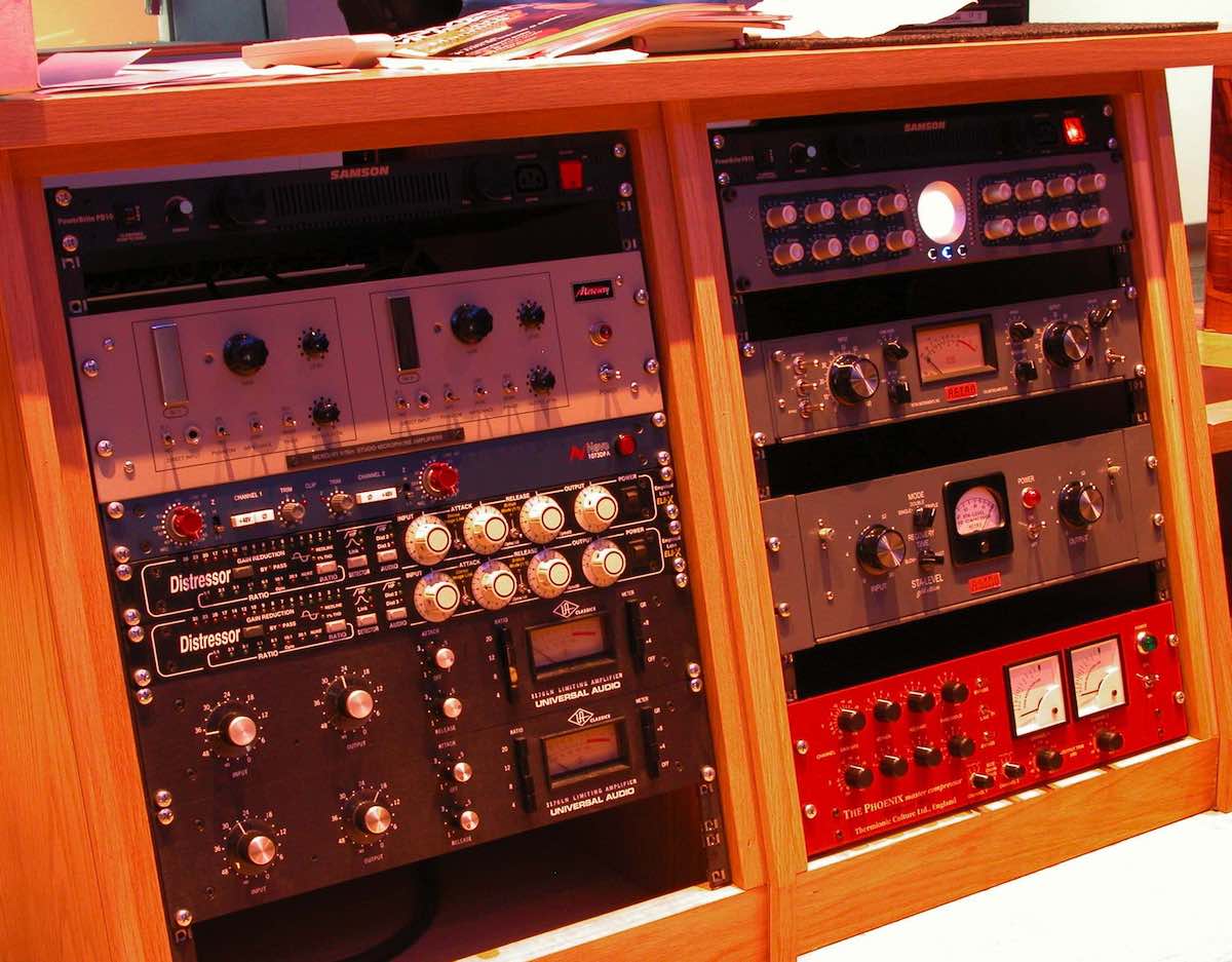 Il rack dell’outboard a sinistra del mixer SSL, con processori di dinamica Empirical Labs, Universal Audio, Elysia, Retro e Thermionic Culture.