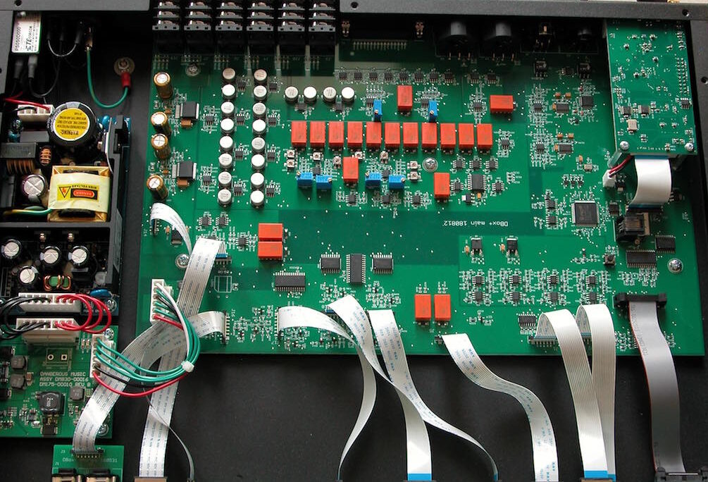 Tutti i componenti interni sono SMD e sono presenti ben sei trimmer classici e otto in versione miniaturizzata. Troviamo anche una connessione Ethernet per gli upgrade e il service. I due ingressi analogici bilanciati e gli otto su dSub 25 sono gestiti, ognuno, da un THAT 1246, un balance receiver con slew rate di 12 V/µsec e rumore inferiore ai -104 dBu, mentre le uscite audio impiegano un THAT 1646 per il bilanciamento del segnale. Due convertitori DA PCM 1789 a 24 bit 192 kHz, range dinamico di 113 dB assicurano la migliore conversione da USB o AES/EBU/SPDIF. Le uscite analogiche sono realizzate con connettori Amphenol, mentre le due uscite cuffie utilizzano Neutrik.
