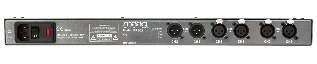 Mäag Audio presenta PREQ2 preamplificatore due canali con EQ, con circuito rigorosamente analogico nello spazio di un'unità rack 1U. A disposizione dell'utente ingresso microfonico commutabile a linea o ad alta impedenza che può beneficiare di: