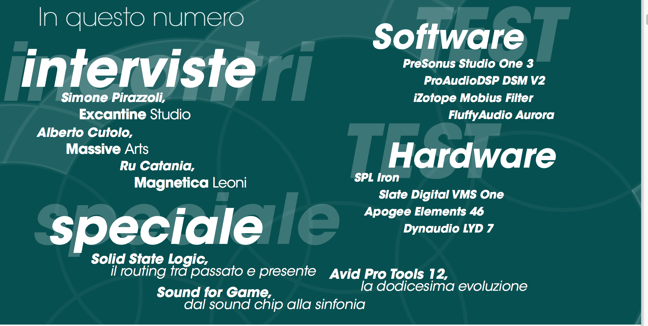 Questo numero è dedicato alle interviste a Simone Pirazzoli, owner dello studio ExCantine di Imola che ha visto passare dai suoi mic e preamp molti nomi noti italiani; ad Aberto Cutolo dei Massive Arts di Milano, colonna portante di una delle sale mastering più apprezzate in Italia e con un corso di mastering imminente. Alla produzione di Magnetica Leoni con lo zampino di Ru Catania, esempio di come il cloud possa unire più menti musicali sotto la stessa produzione. Da ognuno dei tre si può imparare qualcosa di nuovo e scoprire opinioni che non seguono per forza le mode del momento.