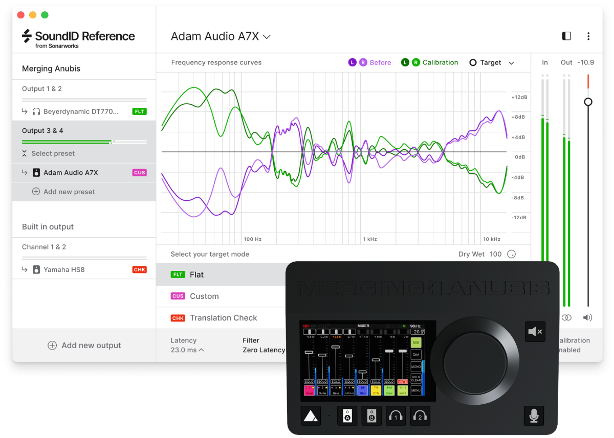 Per la prima volta, una interfaccia audio è in grado di applicare la calibrazione di monitor e cuffie all'uscita audio, senza necessità di caricare plug-in su DAW. La nuova collaborazione tra Merging e Sonarworks permette la lettura e l'applicazione dei profili di SoundID direttamente su Anubis, con equalizzazione, trim e delay generati dal DSP interno dell'interfaccia, permettendo di lavorare da 44,1 kHz fino a 192 kHz.