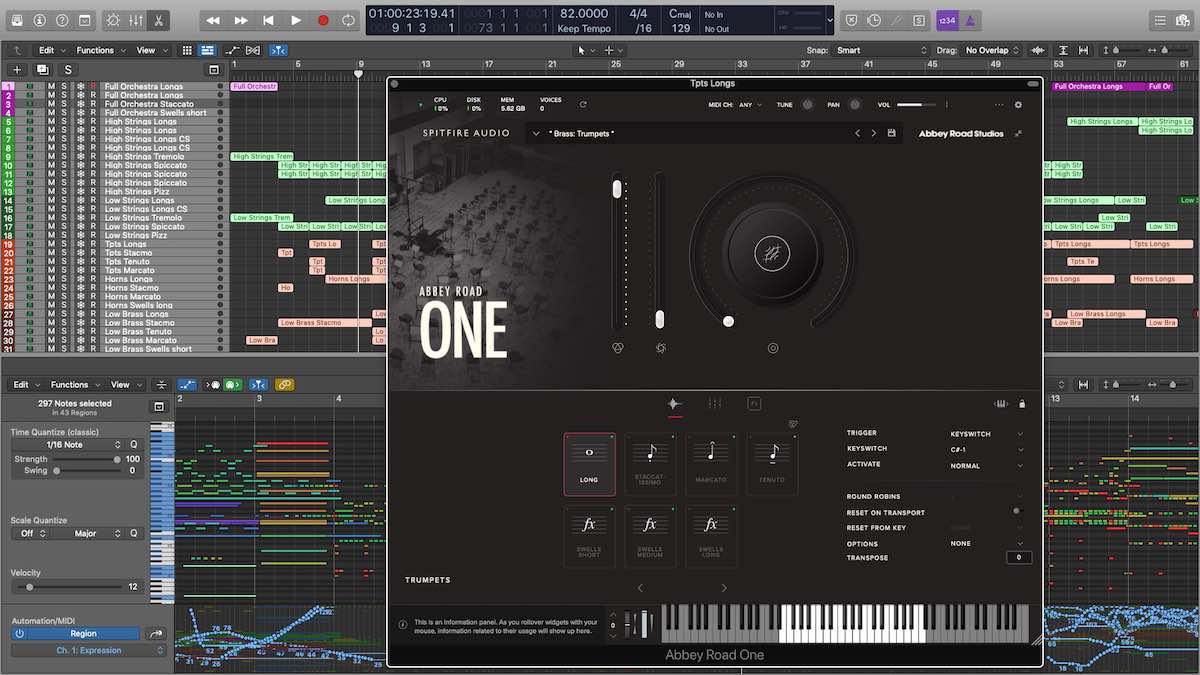 Sono ben 69 le articolazioni disponibili (mai così tanto per una libreria Spitfire) per un massimo di cinque livelli dinamici; sono stati utilizzati per le incisioni fino a 10 microfoni individuali e due mix. La console è quella dello studio 1, la vintage TG Desk (TG12345 MK3).