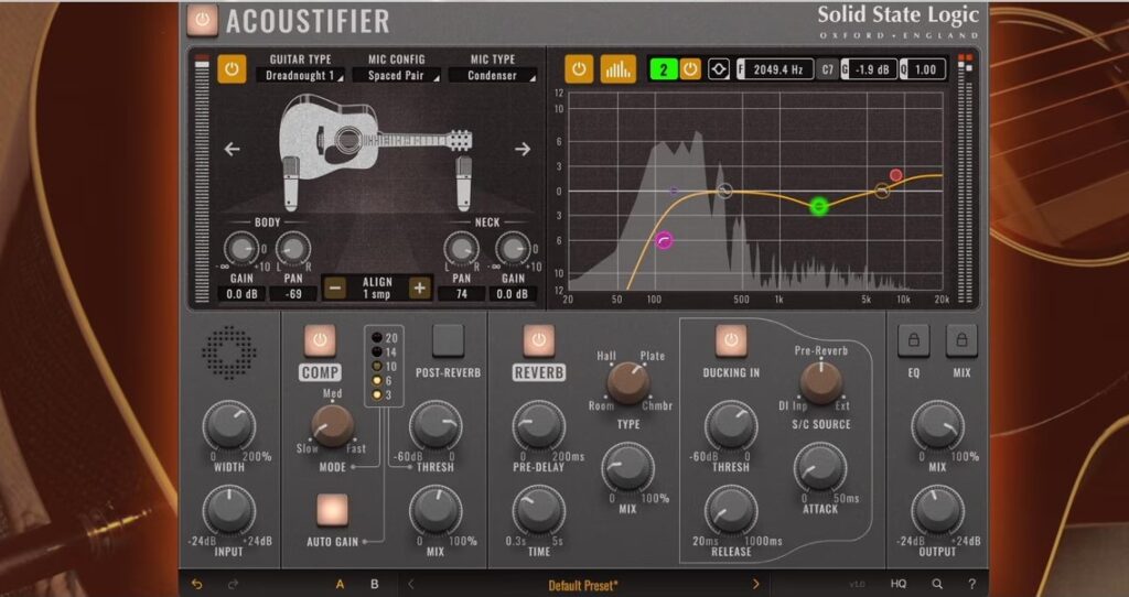 La filosofia di SSL Acoustifier è di avere tutto ciò che ci serve per elaborare il suono di una chitarra acustica in un solo plugin, e in effetti si può dire che, personalmente, non trovo la necessità di utilizzare altro se non dei buoni preamplificatori.