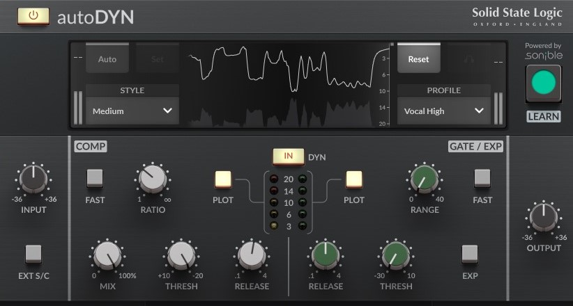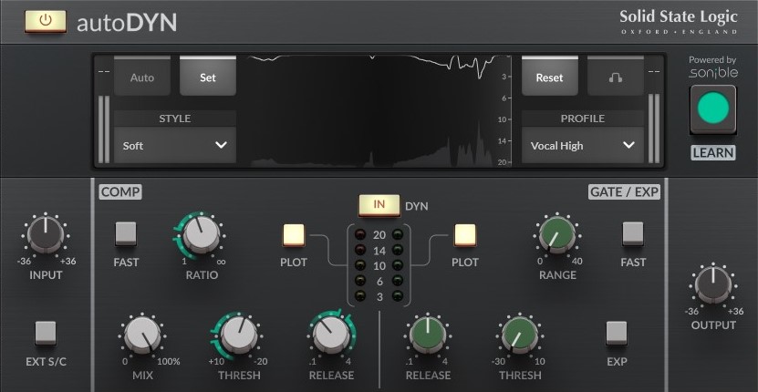 La parte superiore del plugin è dedicata ai controlli di Sonible: il pulsante Learn serve per analizzare per qualche secondo il suono, dopo di che i relativi parametri sono applicati automaticamente. L’expander sembra essere l’unico elemento che non viene preso in considerazione da Sonible, che interviene sulle impostazioni del compressore e, se la traccia lo richiede (per esempio drums) anche sul gate. L’analisi di Sonible può essere adattata allo stile (soft, medium, strong), con il suggerimento relativo al rapporto di compressione, soglia e rilascio. Se si seleziona uno stile differente, i parametri che necessitano di essere modificati sono indicati con un range verde, rispetto allo stato attuale: un semplice click su Set e tutti i parametri si allineano allo Style scelto. Reset riporta alla situazione iniziale.