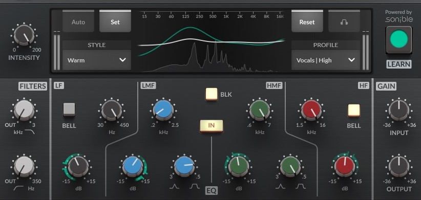 Posto a zero, la curva rimane piatta, a 100 la curva dell’eq è identica a quella suggerita da Sonible, mentre a 200 l’intensità della curva aumenta, modificando proporzionalmente il gain. Come su autoDYN, le modifiche si possono vedere (con il range in verde) prima di applicarle con Set. Intensity non è un controllo di eqalizzazione parallela (non avrebbe alcun senso anche dal punto di vista della fase) ma gestisce quanto l’eq interviene sul segnale originale.