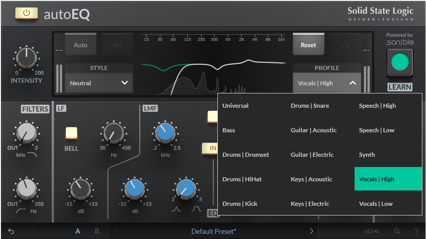 Si fa presto a dire cosa sia autoEQ: è la sezione di equalizzazione della channel stip SSL 4K E integrata con l’AI di Sonible. La parte identica ad autoDYN riguarda la sezione di Sonible, con gli stessi controlli (Auto, Set, Reset, Listen e Learn) ma con Profile differenti (vedi immagine qua sotto). Il numero di profili è aumentato mentre per gli Style troviamo tre opzioni: Warm, Neutral e Bright, che intervengono sul bilanciamento tra basse e alte frequenze. Appare anche un nuovo controllo Intensity che serve per definire quanto le raccomandazioni di Sonible saranno seguite.