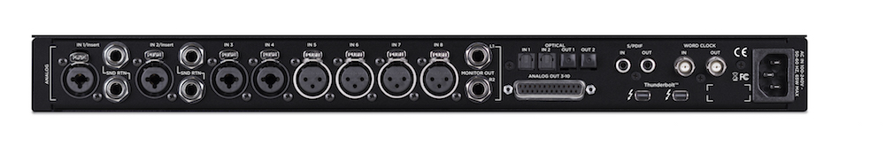 Nel pannello posteriore trovano spazio otto ingressi analogici di cui quattro ibridi (Mic/Line) e i primi due dotati di insert, due uscite monitor, due I/O ADAT oppure SMUX (selezionabili dal software), otto uscite analogiche di tipo DSUB a 25 pin, un S/PDIF, due connessioni Thunderbolt, un world clock e l'alimentazione.