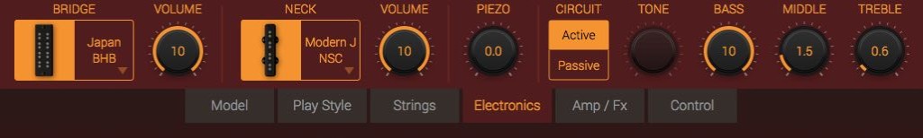 In questa categoria troviamo i parametri relativi alla circuitazione dello strumento (non quindi alla sua amplificazione) ovvero pickup ed elettronica. Sceglieremo quindi il tipo di pickup da posizionare al ponte (bridge) o al manico (neck), miscelandone il timbro dai rispettivi volumi. La funzione Piezo è dedicata alla gestione del timbro in caso di pickup piezoelettrico e infine un equalizzatore (Bass/Middle/Treble) per i circuiti di tipo attivo. È possibile infatti decidere se il nostro basso è dotato di circuitazione attiva o passiva (dalla funzione Circuit Active/Passive) abilitando di fatto l’eq.