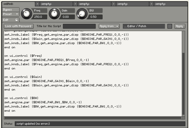 Qui parliamo di una vera e propria programmazione: si realizza un codice utilizzando il linguaggio KSP (Kontakt Script Language). Kontakt prevede un’apposita sezione nell’area di editing dove realizzare lo script. Volendo si può realizzare il codice tramite un editor di testo *.txt e poi importarlo in Kontakt. In questa fase si va a delineare quello che sarà l’audio engine della library, realizzare i legati, definire la GUI e in generale la suonabilità dello strumento. Una volta completato lo script e definita l’interfaccia grafica, editato l’instrument, stabiliti gli effetti interni, i controlli automatizzatili via MIDI, la library è pronta per essere salvata ed utilizzata.
