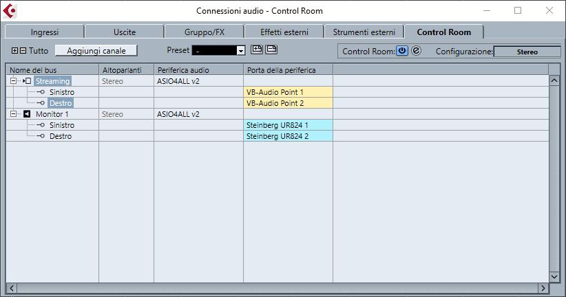 La configurazione della Control Room è analoga a quanto visto per il sistema Mac OS, con la differenza che in questo caso le connessioni virtuali per l’ingresso esterno sono date da VB-Audio.
