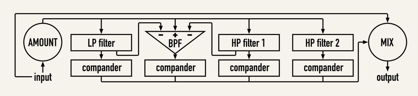 - Air: è forse l'algoritmo che, senza saperlo, avete sentito già migliaia di volte in registrazioni dagli anni sessanta in poi sulle voci. Qui è attiva solo la banda delle altre frequenze, il resto non viene processato, e il risultato è un'eccitazione delle armoniche che rende la voce sempre chiara e presente ma mai fastidiosa, sembra quasi aggiungere una gradevole distorsione e aria, appunto, sulle frequenze altissime, oltre i 10 kHz. L'effetto è meraviglioso e molto musicale, non se ne può fare a meno una volta scoperto il trick. Universal Audio ha incluso tre differenti modifiche del circuito: AIR Sound City, AIR 301 e AIR Simple Circuit Mod, identico a quanto descritto da Orchid Electronics.